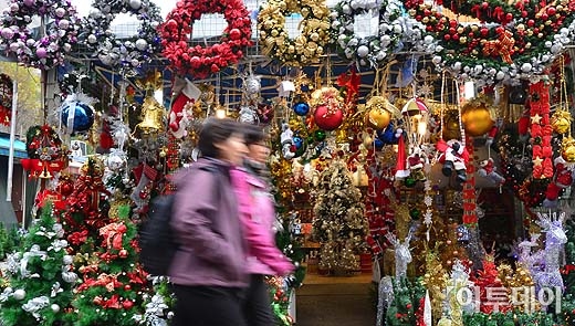 크리스마스를 한 달여 앞둔 24일 오후 서울 중구 남대문시장의 한 상점에 놓인 크리스마스용품들이 시민들의 눈길을 끌고 있다. 방인권 기자 bink7119@