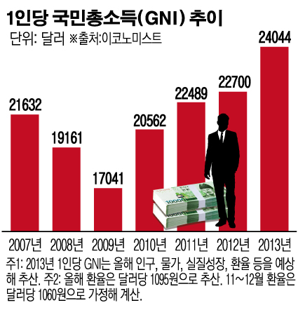 1인당 GNI 추이를 보면 2007년 처음으로 2만달러를 돌파(2만1632달러)했지만 금융위기를 거치면서 2만달러 밑으로 떨어졌다. 이후 2010년 2만562달러로 다시 2만달러대로 올라섰고 2011년 2만2451달러, 작년 2만2700달러로 집계됐다. 올해 1인당 GNI가 비교적 큰 폭으로 늘어난 것은 경기가 회복될 기미를 보이는데다 원화 가치가 상승했기 때문이다.