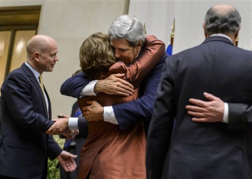 스위스 제네바에서 24일(현지시간) 이란 핵 협상이 타결된 직후 캐서린 애쉬튼 유럽연합(EU) 외교안보 고위 대표(왼쪽에서 두번째)가 존 케리 미국 국무장관(왼쪽 세번째)과 포옹하고 있다. 이란의 핵무기 프로그램을 저지한 것에 대해 버락 오바마 미국 대통령은 “중요한 첫 번째 진전”이라고 말했다. 이란은 농축 우라늄 생산을 5% 이내로 제한하기로 했으며 서방의 경제 제재 해제로 연 70억 달러 규모의 경제적 효과를 볼 전망이다. 제네바/AFP연합뉴스