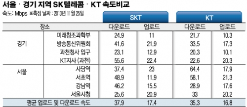 정부과천청사 미래부에서는 KT가 다운로드 21.7Mbps, 업로드 10.3Mbps로 나타났고, SKT는 다운로드 24.9Mbps, 업로드 11Mbps로 나타나 SKT의 속도가 조금 더 빨랐다.