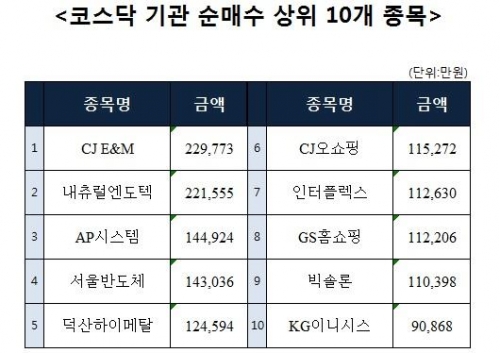 [코스닥 기관 순매수 상위 10개 종목]
