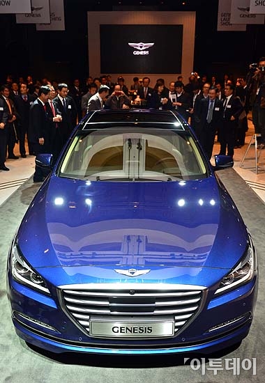 26일 오후 서울 용산구 한남동 그랜드하얏트호텔에서 열린 ‘신형 제네시스 신차 발표회’에서 내외 귀빈들이 신형 제네시스를 살펴보고 있다. 방인권 기자 bink7119@