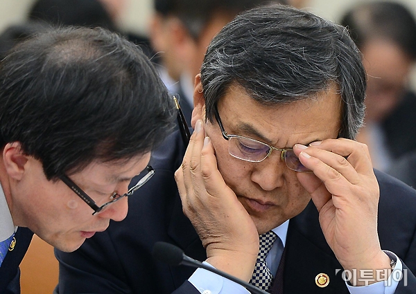 최문기 미래창조과학부 장관이 27일 오전 여의도 국회에서 열린 미래창조과학방송통신위원회 전체회의에 참석해 관계자와 이야기를 나누고 있다. 노진환 기자 myfixer@