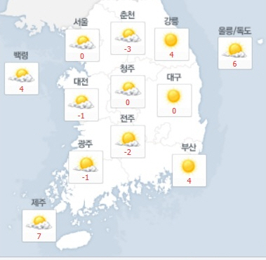 기상청은 내륙에서는 낮과 밤의 기온 차가 커 건강관리에 주의를 당부했다. 낮 기온은 서울 9도, 대전 9도, 대구 12도로 어제와 비슷할 것으로 보인다.