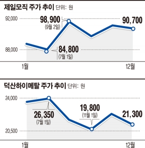덕산 하이메탈은 지난 5월 2만9600원의 최고점을 찍었으나 급락추이를 타 2일 현재 2만1300원에 장을 마감했다.