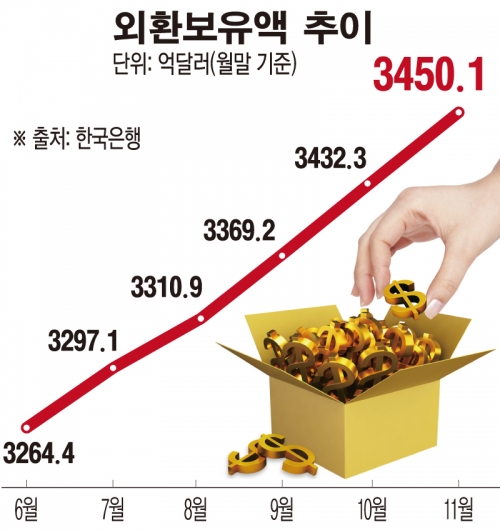한국은행은 외화자산 운용수익 등으로 11월 말 현재 외환보유액이 3450억1000만 달러를 기록, 한 달 전보다 17억9000만 달러 증가했다고 4일 밝혔다.