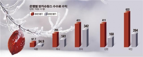 예대마진 축소로 이자 수익이 줄고 있는 판에 방카슈랑스 등 수수료 수익도 같은 처지에 몰린 탓이다.
