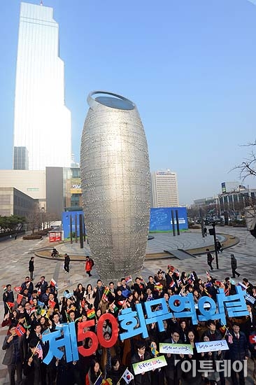 제 50회 무역의 날을 하루 앞둔 4일 오전 서울 강남구 삼성동 무역센터 피아노분수광장에서 한국무역협회, 코엑스, 대학생무역홍보대사들이 무역센터 트레이드타워와 무역 1조 달러 탑을 배경으로 퍼포먼스를 하고 있다. 방인권 기자 bink7119@