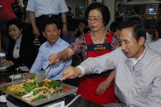 ▲온라인상에서 손대 볶음 레시피가 화제를 모으고 있다. 사진은 지난 2007년 당시 대선 후보였던 이명박 전 대통령이 재래시장에 들러 순대 볶음을 먹는 모습. (사진=뉴시스)