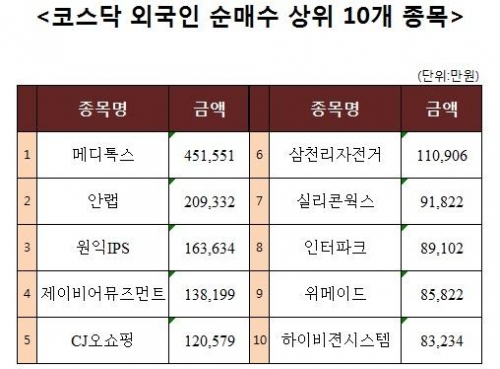 [코스닥 외국인 순매수 상위 10개 종목]
