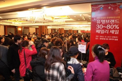 롯데백화점 본점은 4일 하루 소공동 롯데호텔 3층 사파이어볼룸에서 ‘2013년 총결산 패션잡화 브랜드 패밀리세일’을 통해 총 80여개 브랜드, 50억원 상당의 물량을 최대 90%까지 할인했다. 롯데백화점이 일반 고객 대상 할인행사를 외부에서 여는 것은 이번이 처음이며, 준비된 물량은 통상적인 세일 행사의 두 배 규모다.