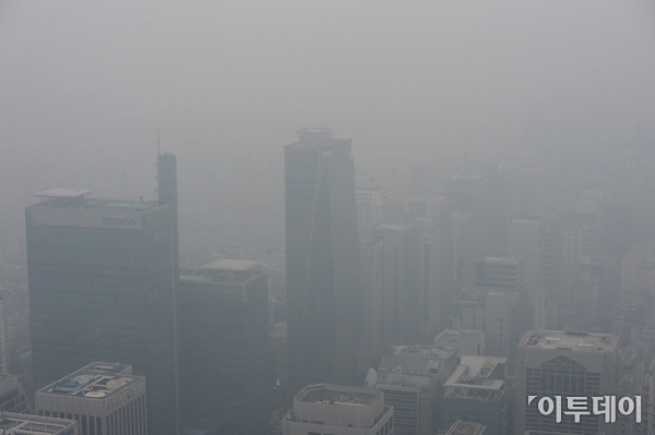 중국발 미세먼지의 농도가 오후 들어 더 높아지고 있다. 기상청이 측정한 서울 지역의 평균 미세먼지 농도는 오전 1시 153㎍/㎥를 기록했다가 오전 8~10시 120㎍/㎥로 떨어졌다. 그러나 오전 11시 131㎍/㎥로 가파르게 증가하기 시작해 오후 3시 기준으로 183㎍/㎥까지 치솟았다. 5일 오후 서울 테헤란로 인근 도심이 짙은 미세먼지로 인해 뿌옇게 보이고 있다. 노진환 기자 myfixer@