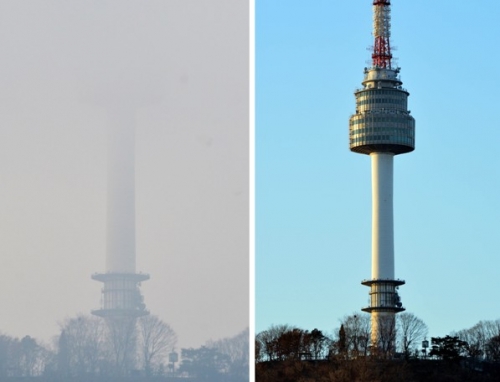 수도권 미세먼지 주의보가 해제된 6일 오전 서울 중구 충무로 남산스퀘어에서 바라본 N 서울타워의 모습. 사진 왼쪽은 지난 4일 스모그로 인해 하단만 보이는 N서울타워의 모습이다. 지난 4일 오후 내려졌던 수도권 미세먼지, 5일 초미세먼지 주의보는 6일 0시를 기해 해제됐다.