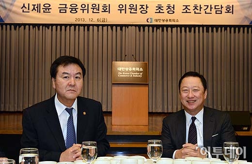 신제윤 금융위원장과 박용만 대한상공회의소회장이 6일 오전 서울 중구 남대문로 대한상공회의소에서 열린 조찬간담회에서 환담을 나누고 있다. 방인권 기자 bink7119@