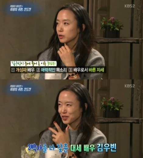 전도연은 7일 KBS 2TV '연예가중계' 게릴라 데이트에 출연해 눈 여겨보는 후배로 김우빈을 꼽으며 "개성, 목소리, 배우로서 자세. 3박자를 다 갖춘 대세 배우다"고 극찬했다.