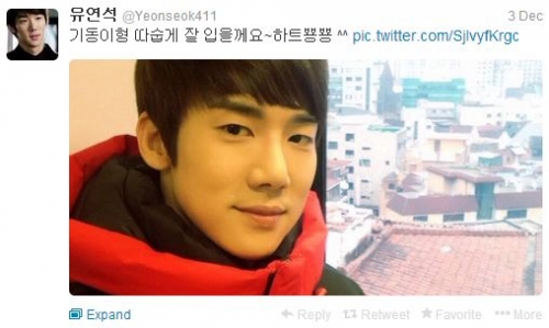 유연석은 최근 자신의 트위터에 "기동이형 따숩게 잘 입을께요~하트뿅뿅 ^^"이라는 글과 함께 한 장의 사진을 올렸다. 사진 속 유연석은 빨간색 점퍼를 입고 있다. 특히 그는 엷은 미소를 띄고 있어 보는이들의 마음을 훈훈하게 하고 있다.