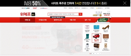 소셜커머스 위메프의 '50% 블랙프라이스 세일' 행사에 접속자가 몰리자 행사 시간을 1시간 연장하기로 했다. 행사 종료는 11시다.
