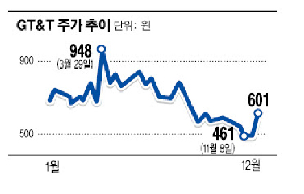 한편, 이 같은 자산 매각 결정에 연일 내리막길을 걷던 GT&T의 주가는 모처럼 반등에 성공하며 전일 상한가로 장을 마쳤다.