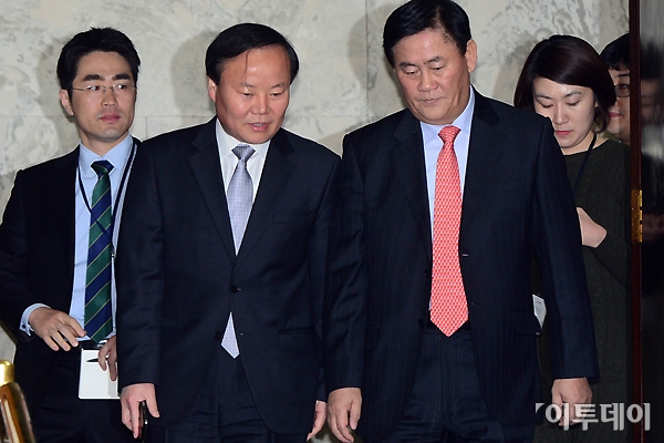 최경환 새누리당 원내대표와 김재원 국정원개혁특위 간사가 10일 오전 여의도 국회에서 열린 원내대책회의에 참석하고 있다. 노진환 기자 myfixer@
