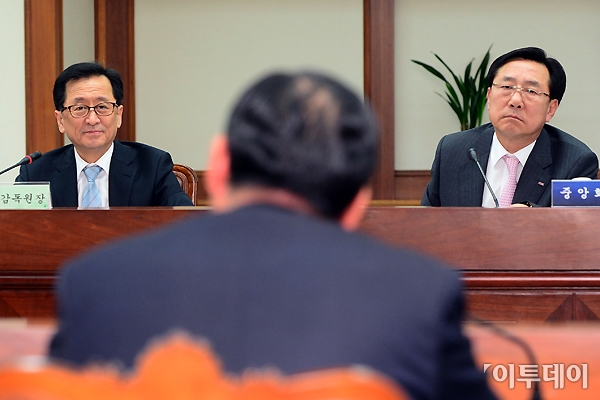 최수현 금융감독원장과 김기문 중소기업중앙회 회장이 10일 오후 여의도 중소기업중앙회에서 열린 ‘금융감독원장과 소상공인의 손톱 밑 가시 간담회’에서 참석자의 발언을 듣고 있다. 노진환 기자 myfixer@