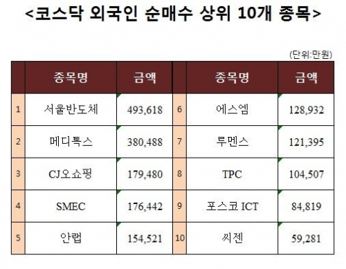 [코스닥 외국인 순매수 상위 10개 종목]