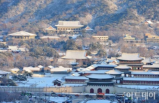 서울ㆍ경기지역에 많은 눈이 내린 11일 오전 서울 태평로에서 바라본 청와대와 경복궁에 눈이 쌓여있다.