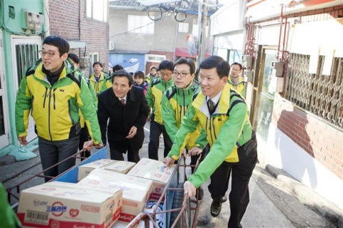 원종규 코리안리 사장이 사랑의 쌀·라면 배달에 나섰다.