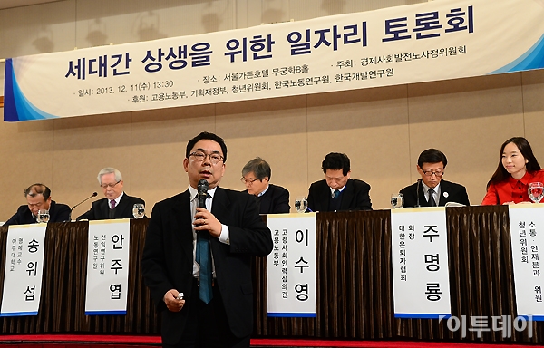 ‘2013 세대간 상생을 위한 일자리 토론회’가 11일 오후 마포구 서울가든호텔에서 경제사회발전노사정위원회 주최로 열렸다. 안주엽 노동연구원 선임연구위원이 ‘함께 마음껏 일하는 사회:현안과 정책과제’로 발제를 하고 있다. 노진환 기자 myfixer@