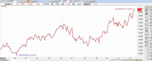 올해 초 2만6000원선에 거래되던 것을 감안하면 1년여만에 42.9%나 급등한 것이다. 같은기간 전기전자(IT) 업종지수 -4.12%를 크게 상회하는 성적이다. 시가총액도 26조1354억원으로 불어나 기아차, 한국전력, 삼성생명은 단숨에 제치고 지난해 12위에서 5위로 껑충 뛰었다.