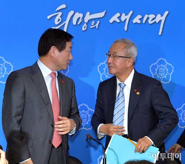 현오석 부총리 겸 기획재정부 장관(오른쪽)이 11일 오후 정부서울청사에서 공공기관 정상화 대책을 발표한 뒤 유정복 안전행정부 장관과 대화를 나누고 있다. 이 날 회견장에는 현 경제부총리를 비롯해 유정복 안전행정부 장관, 박기풍 국토교통부 1차관, 김상규 기획재정부 재정업무관리관, 박청원 산업통상자원부 기획조정실장이 참석했다. 최유진 기자 strongman55@