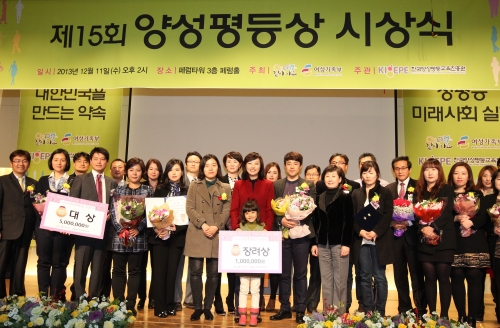 조윤선 여성가족부 장관이 11일 오후 서울 중구 페럼타워에서 열린 `제15회 양성평등상 시상식'에 참석해 수상자들과 기념촬영을 하고 있다.