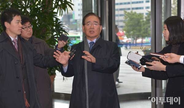 한동우 신한금융그룹회장이 12일 오전 서울 중구 태평로2가 신한은행 본점 로비에서 취재진의 질문에 답하고 있다. 이 날 신한금융은 이사회를 열고 한 회장을 차기 대표이사 회장으로 추천할 예정이다. 최유진 기자 strongman55@