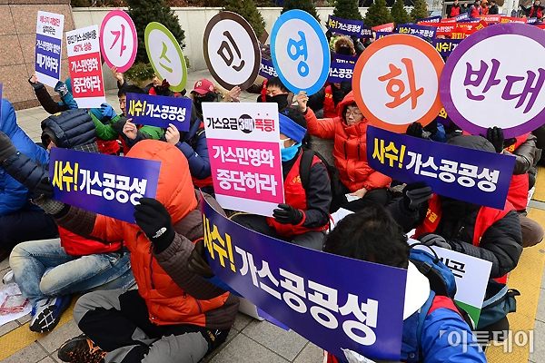 공동운수노조 한국가스공사지부가 12일 오전 여의도 국민은행 앞에서 가스민영화 반대 결의대회를 갖고 조합원들이 가스 민영화를 반대하며 구호를 외치고 있다. 노진환 기자 myfixer@
