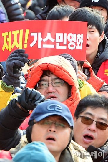 공동운수노조 한국가스공사지부가 12일 오전 여의도 국민은행 앞에서 가스민영화 반대 결의대회를 갖고 조합원들이 가스 민영화를 반대하며 구호를 외치고 있다. 노진환 기자 myfixer@