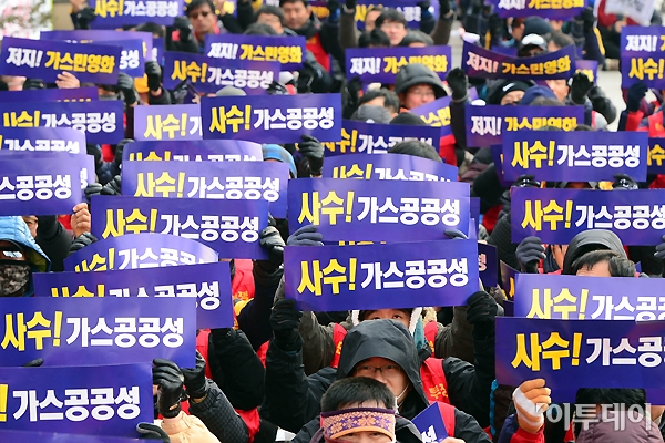 공동운수노조 한국가스공사지부가 12일 오전 여의도 국민은행 앞에서 가스민영화 반대 결의대회를 갖고 조합원들이 가스 민영화를 반대하며 구호를 외치고 있다. 노진환 기자 myfixer@