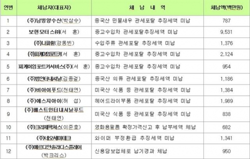 관세청이 공개한 신규 고액상습체납 법인 명단