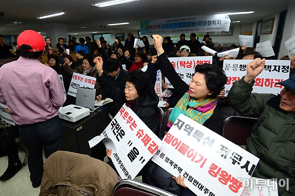 행복주택 공릉지구 주민설명·의견청취회가 12일 오후 서울 노원구 공릉동 한국토지주택공사 서울본부 중계사업단에서 열릴 예정이었지만 주민들의 반대로 무산됐다. 이날 오후 설명회에 참석한 주민들이 행복주택 건립 반대를 외치고 있다. 노진환 기자 myfixer@