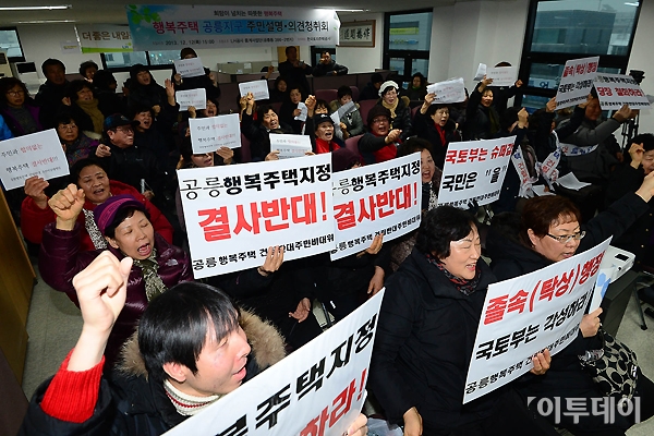행복주택 공릉지구 주민설명·의견청취회가 12일 오후 서울 노원구 공릉동 한국토지주택공사 서울본부 중계사업단에서 열릴 예정이었지만 주민들의 반대로 무산됐다. 이날 오후 설명회에 참석한 주민들이 행복주택 건립 반대를 외치고 있다. 노진환 기자 myfixer@