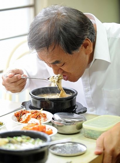 ▲해장음식 대부분은 아스파라긴산과 타우린 등이 풍부한 국물요리다. 사진은 2010년 서울 은평을 보궐선거에서 당선된 이재오 의원이 당선 이튿날 서울 불광동 자신의 단골 해장국집에서 아침식사를 하고 있는 모습. (사진=뉴시스)