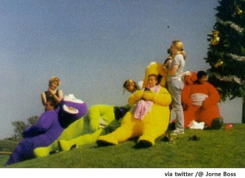 공개된 사진 속에는 텔레토비들이 휴식을 취하고 있는 모습이다. 그러나 일반적으로 우리가 아는 텔레토비들과 달리 모두 가면을 벗고 있다는 것.
