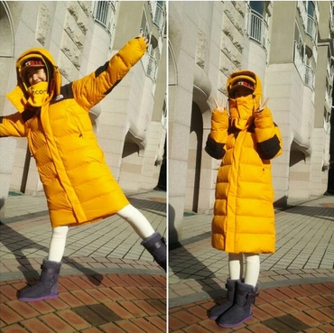 사진 속 진세연은 노란색 롱 패딩을 입고 얼굴 전체를 보호하고 있다.