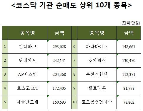 [코스닥 기관 순매도 상위 10개 종목]