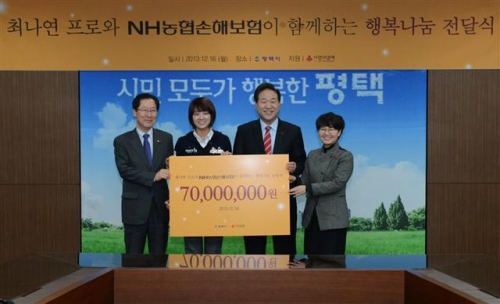 16일 농협손보에 따르면 김 대표와 최 선수는 경기도 평택시 소재 평택시청에서 조손가정을 위한 후원금 전달식을 가졌다.