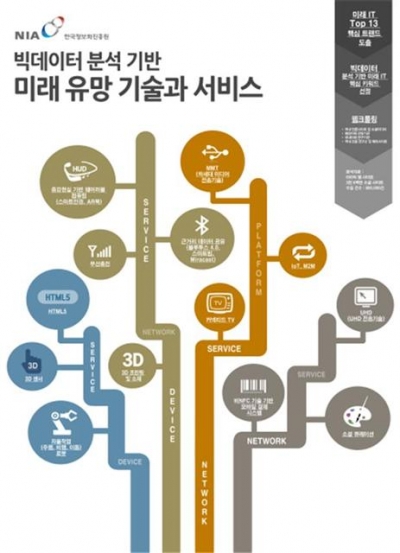 빅데이터 분석을 통해 3D 프린팅, 웨어러블 컴퓨팅, 무선충전, 근거리 데이터 공유, 자율작업 로봇, 3D센서, IoT, 무선결재시스템, UHD, MMT, 소셜큐레이선, HTML5이 미래 주목해야할 13대 ICT 분야 기술 및 서비스로 나타났다.