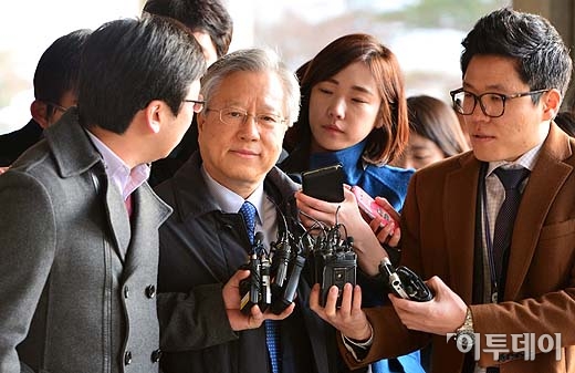 횡령과 배임 혐의를 받고 있는 이석채 전 KT 회장이 서초동 서울중앙지검으로 조사를 받기 위해 들어서며 취재진의 질문을 받고 있다. 방인권 기자 bink7119@