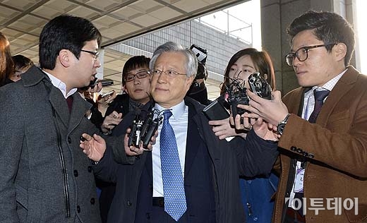 횡령과 배임 혐의를 받고 있는 이석채 전 KT 회장이 서초동 서울중앙지검으로 조사를 받기 위해 들어서며 취재진의 질문을 받고 있다. 방인권 기자 bink7119@