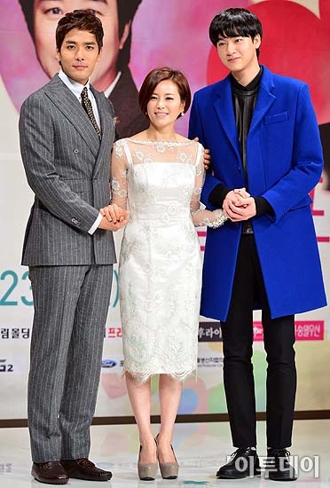 배우 박윤재와 견미리, 유민규가 19일 오후 서울 영등포구 타임스퀘어 아모리스홀에서 열린 MBC 일일드라마 '빛나는 로맨스‘ 제작발표회에서 포토타임을 갖고 있다.