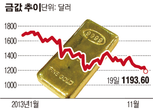 뉴욕상업거래소(NYMEX)에서 19일(현지시간) 오는 2014년 2월 인도분 금 선물 가격은 전일 대비 41.40달러(3.4%) 하락해 온스당 1193.60달러를 기록했다고 블룸버그통신이 보도했다. 이는 지난 2010년 8월 이후 최저치다.