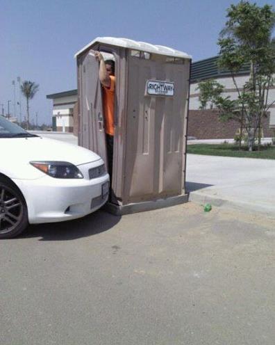사진 속에는 간이 공중 화장실 바로 앞에 주차한 차 때문에 한 남성이 나오지 못하는 모습이 담겨있다.
