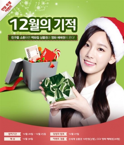 이번 이벤트는 크리스마스를 함께 보내고 싶은 친구를 초대해 페이스북에 태그하면 참여가 가능하다. 추첨을 통해 백화점 상품권 10만원권(3명)과 CGV 영화예매권(20명/1인 2매)을 각각 증정한다.